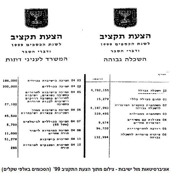 כלומר, בזמן שהאוניברסיטאות מקבלות לשנה למעלה מארבע מליארד ושבע מאות מליון ש"ח, מקבלות הישיבות על כל נספחיהן וסניפיהן: ישיבות הסדר, כוללים לגמלאים