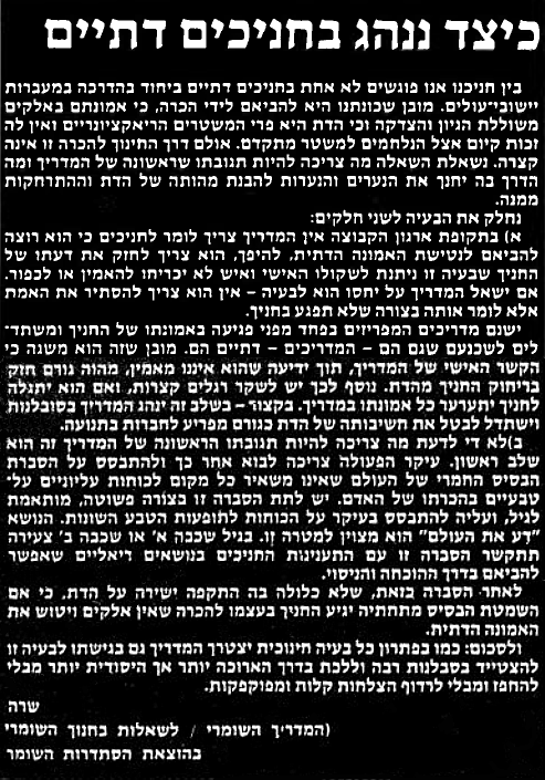 בהזדמנות זו לא נוכל להתעלם מלהצביע בפני ציבור ההורים על עובדה מצערת דומה, אשר אף-על-פי שלמעשה טמון בה עוול לאמת ולהיסטוריה, מקובלת היא בארץ בבתי ספר ממלכתיים רבים, מתוך הסתרת מידע חיוני מילדינו הלומדים בהם. והכוונה להקניית ולימוד חגי ישראל רק לאחר ריקונם מן התוכן היהודי המקורי והאמיתי שלהם.