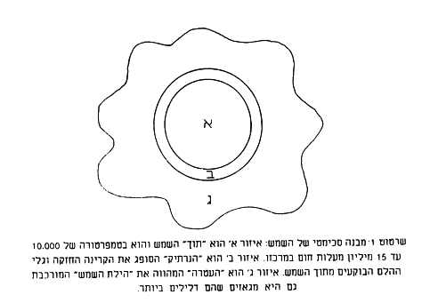 שרטוט 1 מראה את המבנה של השמש כפי שהוא ידוע לנו היום: איזור א' הוא פנים השמש. שם הטמפרטורה גבוהה מאד (עד 15 מליון מעלות חום במרכז). באיזור זה הקרינה היא חזקה ביותר בקרינה אולטרא סגולה, קרינת X (רנטגן), וכן קרינת גמא. אם קרינות אלו היו מגיעות ישר לכדור הארץ הן היו שורפות את כל העולם. שכבה ב' היא היא הנרתיק האחרון הבולם קרינה זו וכן את גלי ההלם הבוקעים מתוך השמש "ומרככת" אותם. שכבה זו נקראת "פוטוספירה" והיא בטמפרטורה של 6000 מעלות.