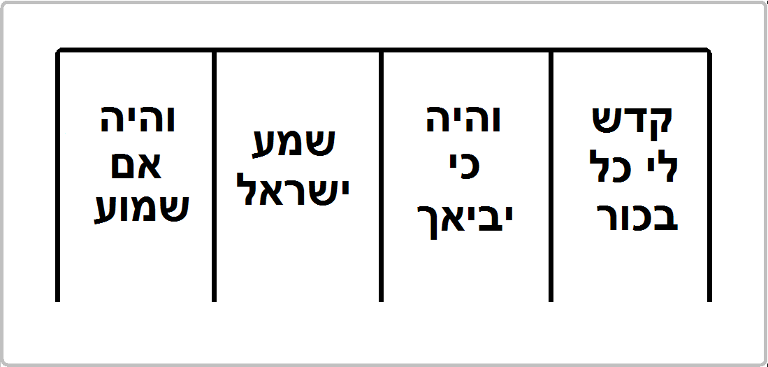 (דברים ו-ד) 'שְׁמַע' (דברים יא-יג) 'וְהָיָה אִם שָׁמֹעַ' (במדבר טו-לז) 'וַיֹּאמֶר'. וּמַקְדִּימִין לִקְרוֹת פָּרָשַׁת שְׁמַע מִפְּנֵי שֶׁיֵּשׁ בָּהּ יִחוּד הַשֵּׁם וְאַהֲבָתוֹ וְתַלְמוּדוֹ שֶׁהוּא הָעִקָּר הַגָּדוֹל שֶׁהַכּל תָּלוּי בּוֹ. וְאַחֲרֶיהָ וְהָיָה אִם שָׁמֹעַ שֶׁיֵּשׁ בָּהּ צִוּוּי עַל (זְכִירַת) שְׁאָר כָּל הַמִּצְוֹת. וְאַחַר כָּךְ פָּרָשַׁת