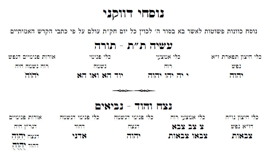 א. דא תהא למיקם כי הכונות שנדפסו מדי יום יום זאת לפנים על ספר חקה טעו במדבר, ואעיקרא הכונות ההם לא צדקו יחדיו כפי כתבי הקדש האמתיים דשכיחי בארץ מצרים ובהר הקדש בירושלים ת''ו, כתובים באצבע הרב מורנו הרב שמואל ויטאל זלה''ה והדברים עתיקים מטהרת יד הקדש מר אביו מורנו הרב חיים ויטאל זצ''ל. ולכן כשנדפס הספר הלז בויניציאה שם נמצאתי אנכי איש צעיר ומסרתי ביד מעלת הגביר המדפיס אהובנו יצ''ו נסח הכונות ככל הנמצא אתי, שהבאתי מעיר הקדש ירושלים ת''ו, ומעלת הגביר יקירנו המדפיס הנזכר, הדפיסם בסוף הדף בפני עצמו בשם נסחי דוקני ה'ן מפטירין: